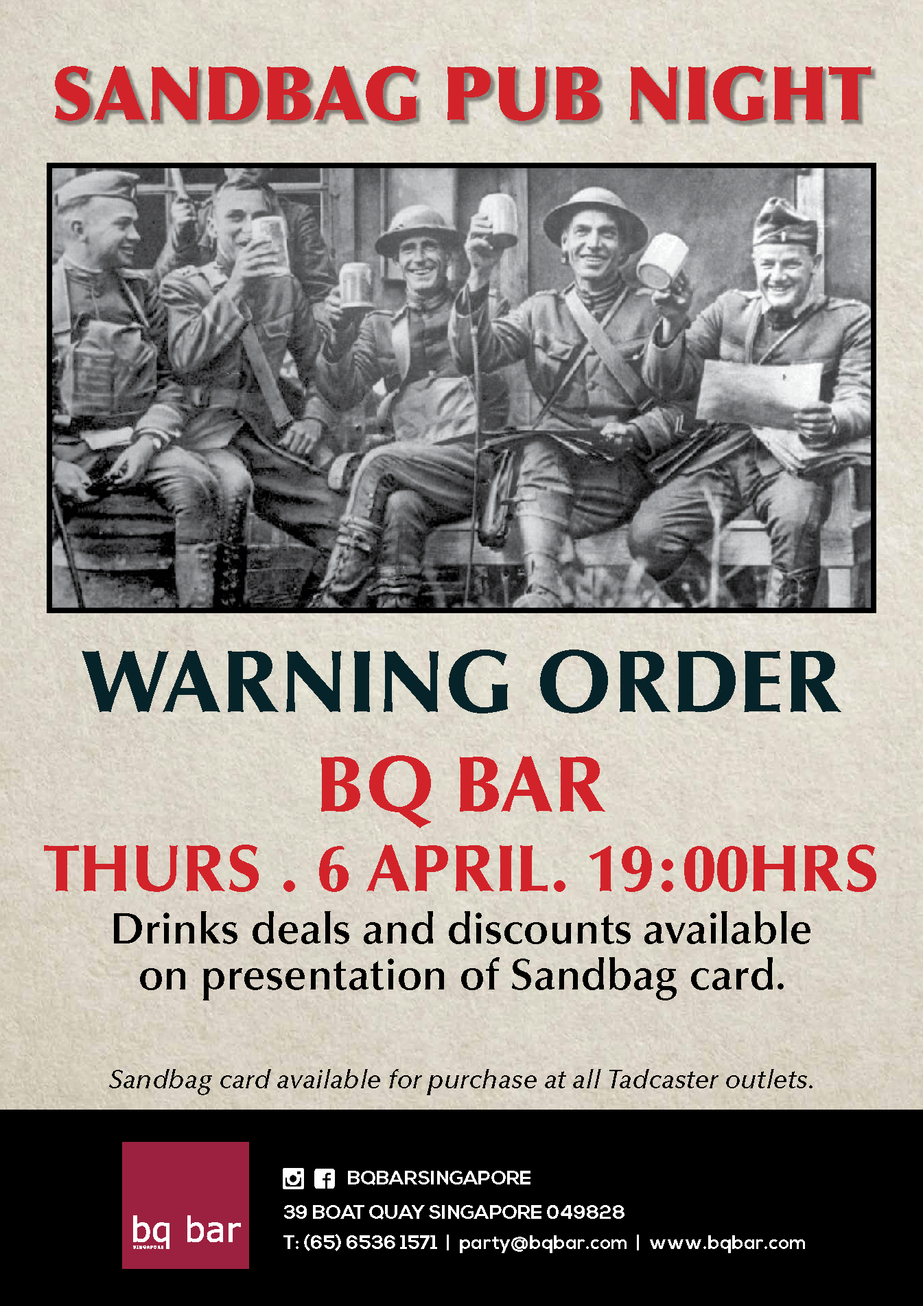 April Muster 6 April 2017 | No Comments Loading Map.... 39 Boat Quay - SingaporeEvents 1.2865671 103.84963390000007 Date/Time Date(s) - 06/Apr/20177:00 pm - 11:30 pm Location BQ Bar Categories Regular Muster When: Thursday 6th April Where: BQ Bar, 39 Boat Quay Time: From 7PM BQ – Sandbaggers Pub Night-2